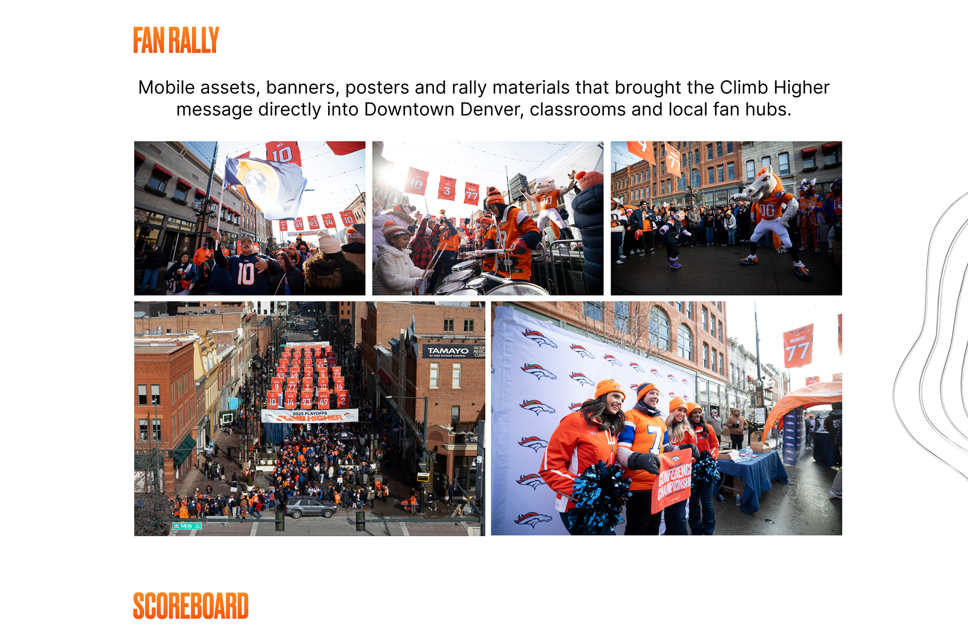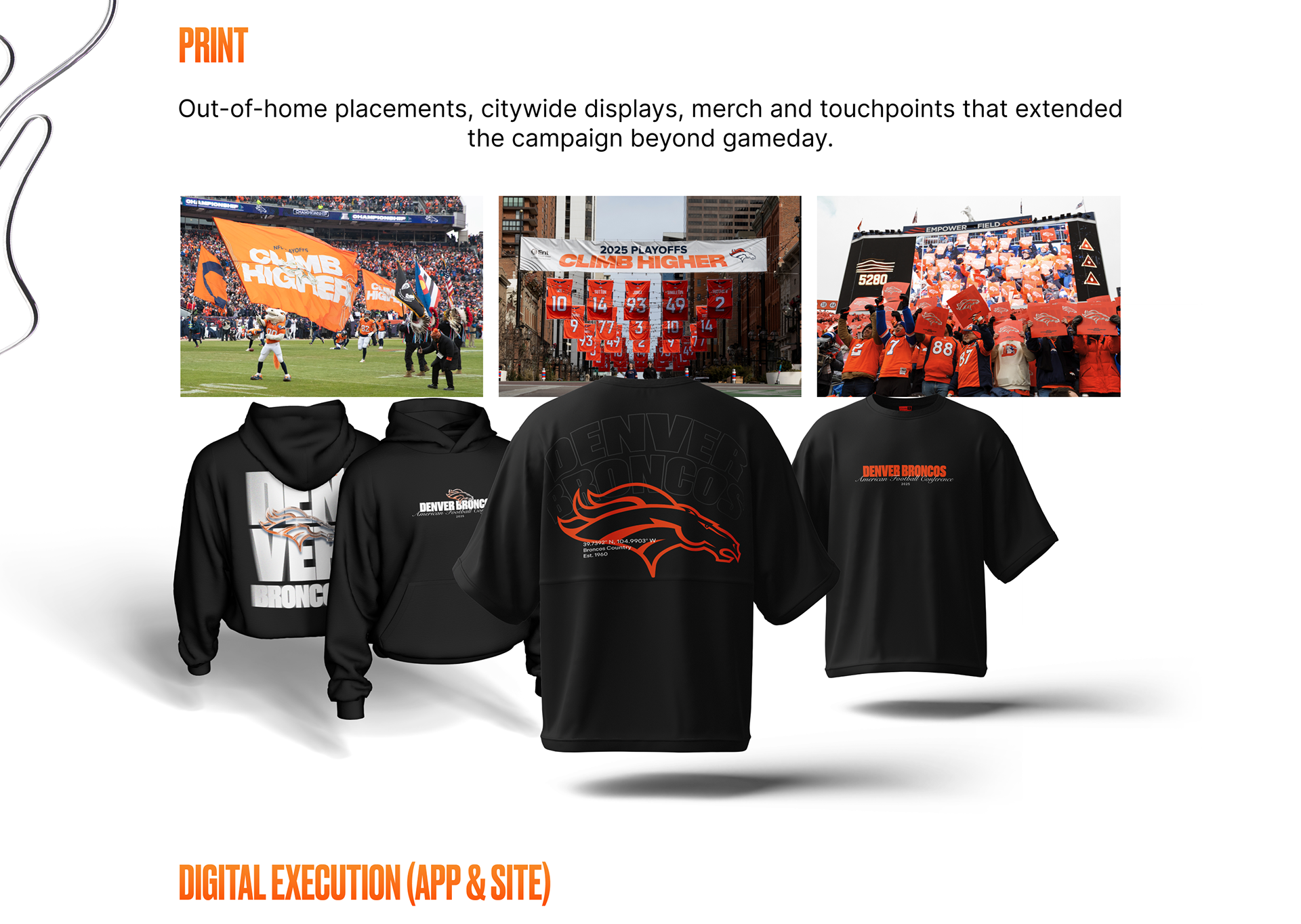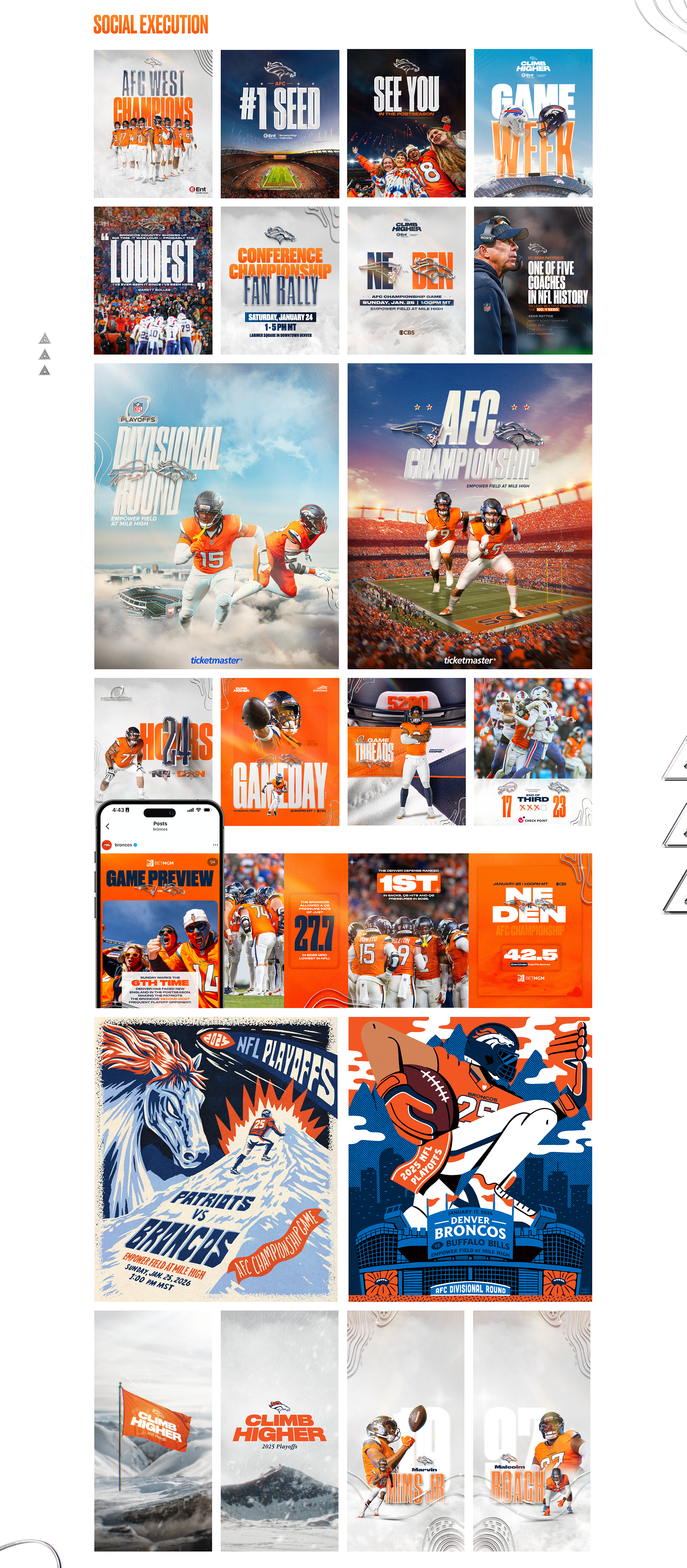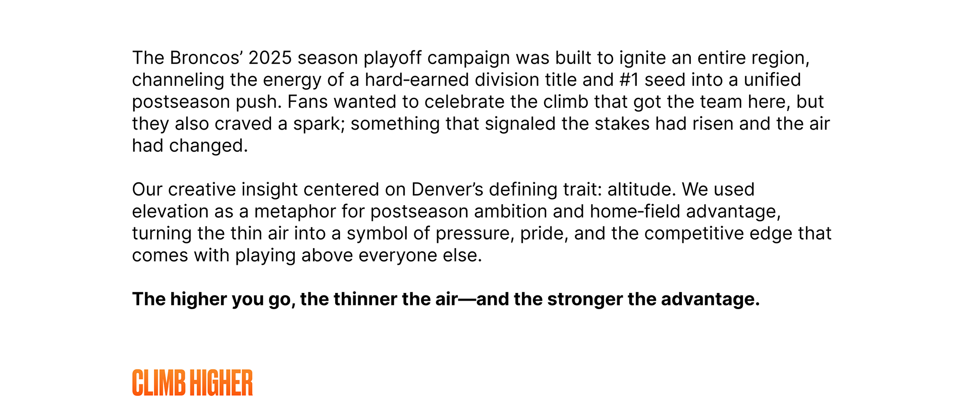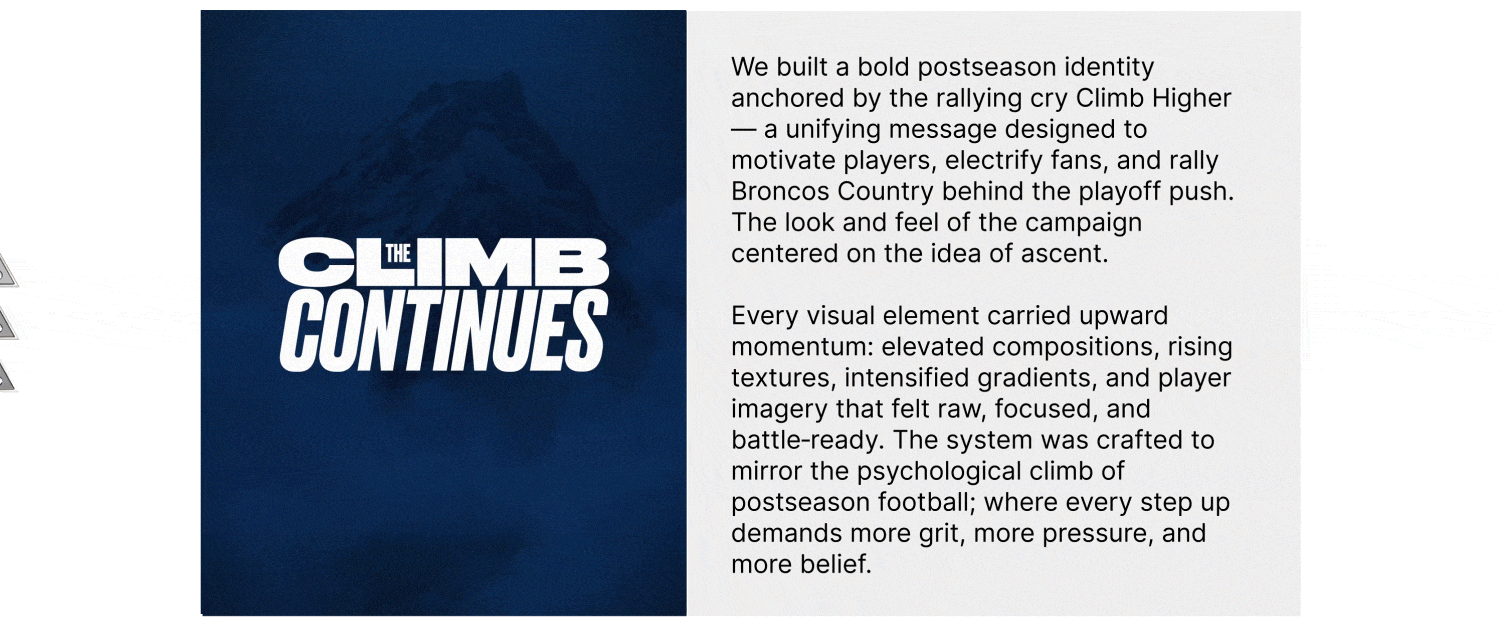 The Broncos 2025 playoff campaign was designed to rally an entire region behind a postseason push, energizing fans, celebrating a hard‑earned division title and #1 seed, and creating a unified momentum heading into the NFL playoffs. Fans want to celebrate the journey that got the team there, but they also want an emotional spark that signals something bigger is ahead. Our insight: use Denver’s unique altitude identity as a metaphor for postseason ambition and homefield advantage. The higher you go, the thinner the air — and the stronger the advantage.